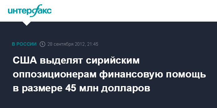 Вашингтон. 28 сентября. ИНТЕРФАКС - Власти США предоставят сирийским оппозиционерам 30 млн долларов в качестве гуманитарной помощи, а также 15 млн в виде "нелетальной поддержки", сообщила госсекретарь США Хиллари Клинтон на полях сессии Генассамблеи в Нью-Йорке.