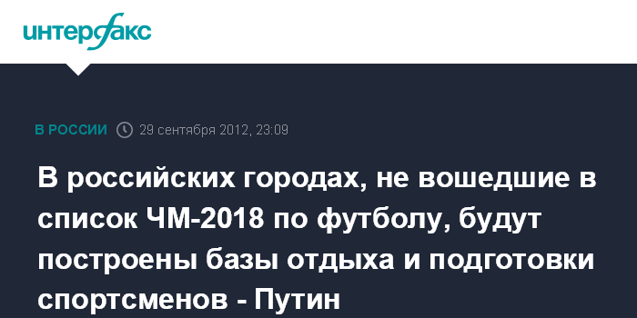 Москва. 29 сентября. ИНТЕРФАКС - В городах России, которые не попадут в основной список участников ЧМ по футболу 2018 года, будут построены базы подготовки и отдыха спортсменов, заявил президент РФ Владимир Путин.