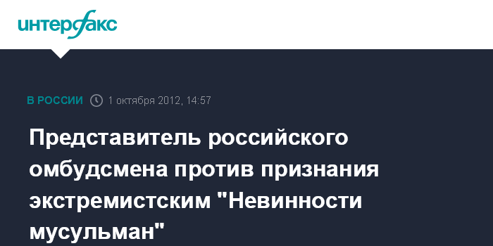 Москва. 1 октября. INTERFAX.RU - Представитель уполномоченного по правам человека в РФ возражает в суде против признания экстремистским размещенного в Интернете антиисламского фильма "Невинность мусульман", вызвавшего массовые беспорядки во многих странах мира.