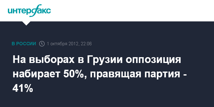 Согласно этим данным, оппозиционная коалиция "Грузинская мечта" получила поддержку 50% избирателей в Грузии в ходе парламентских выборов, правящая партия "Единое национальное движение" - 41%, партия "Христиан-демократическое движение" - 4%.