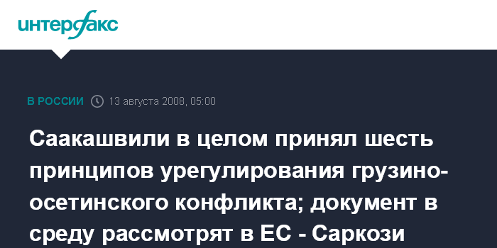 Саакашвили в целом принял шесть принципов урегулирования грузино- осетинского конфликта; документ в среду рассмотрят в ЕС - Саркози