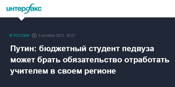 "Я думаю, в принципе, возможно было бы что сделать: если в педвузы едут учиться молодые люди по путевкам регионов и обучаются там на бюджетной основе, а как правило, за счет самих регионов, то тогда заранее можно подписывать контракт о том, что они получают образование, но обязаны отработать в каком-то регионе", - сказал Путин в ходе общения с финалистами конкурса "Учитель года России-2012".