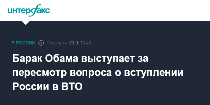 Вашингтон. 13 августа. INTERFAX.RU - Кандидат в президенты США от демократической партии Барак Обама считает необходимым пересмотреть вопрос о переговорах по вступлению России в ВТО в связи с действиями вооруженных сил РФ в Южной Осетии.