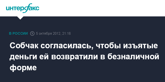 Москва. 5 октября. INTERFAX.RU - Телеведущая Ксения Собчак уведомила следствие о том, что не против возврата изъятых у нее денег по безналичному расчету.
