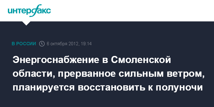 Москва. 6 октября. INTERFAX.RU - Энергетики ОАО "МРСКЦентр" восстанавливают энергоснабжение в Смоленской области, нарушенное в результате сильного ветра в субботу.