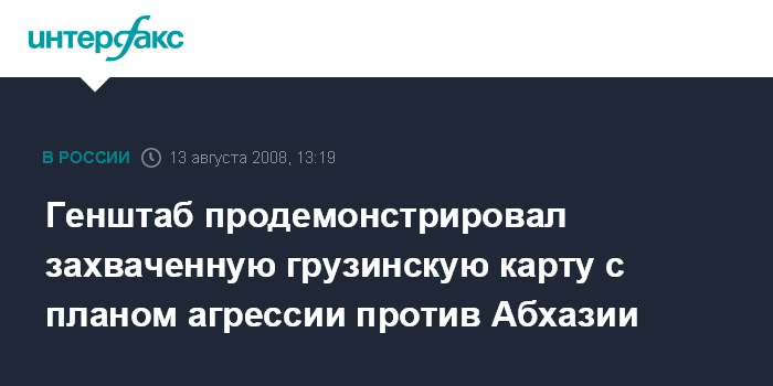 Москва. 13 августа. INTERFAX.RU - Российские вооруженные силы захватили в Абхазии план Грузии по вторжению на абхазскую территорию, заявил замначальника Генштаба РФ генерал-полковник Анатолий Ноговицын. В среду на пресс-конференции в Москве он продемонстрировал журналистам захваченный план.