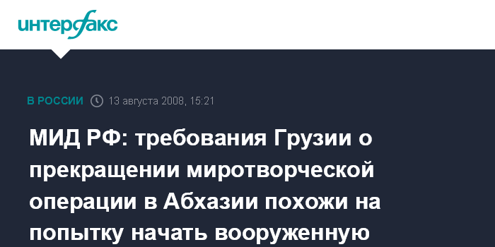 Москва. 13 августа. INTERFAX.RU - Требования Грузии о прекращении миротворческой операции в Абхазии может являться попыткой подготовить новую вооруженную авантюру против этой непризнанной республики, заявляет МИД РФ.