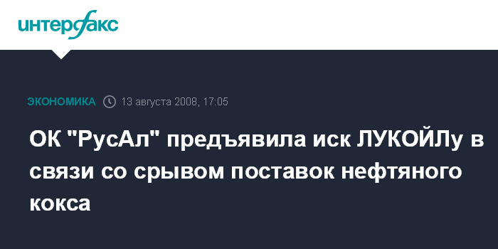Москва. 13 августа. INTERFAX.RU - Объединенная компания "Российский алюминий" (ОК "РусАл") предъявила иск нефтяной компании "ЛУКОЙЛ"в связи со срывом поставок нефтяного кокса, говорится в сообщении ОК "РусАл".