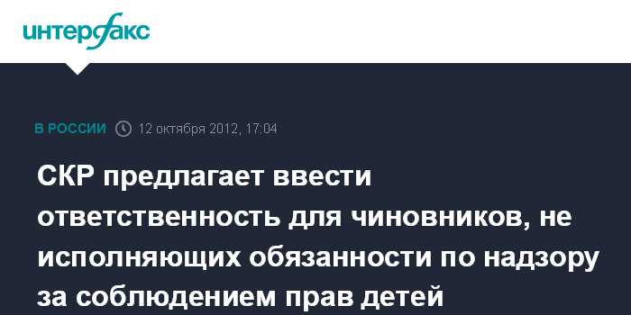 Москва. 12 октября. INTERFAX.RU - Следственный комитет РФ предлагает ввести уголовную ответственность для чиновников, не исполняющих обязанности по надзору за соблюдением прав детей, сообщил в пятницу глава ведомства Александр Бастрыкин.