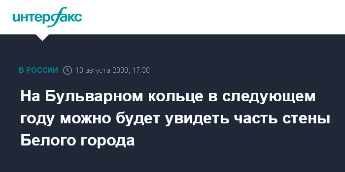 Москва. 13 августа. INTERFAX.RU - В будущем году москвичи и гости столицы смогут увидеть сохранившуюся часть стены Белого города на Хохловской площади на Бульварном кольце, сообщил в среду на пресс-конференции главный археолог Москвы Александр Векслер.