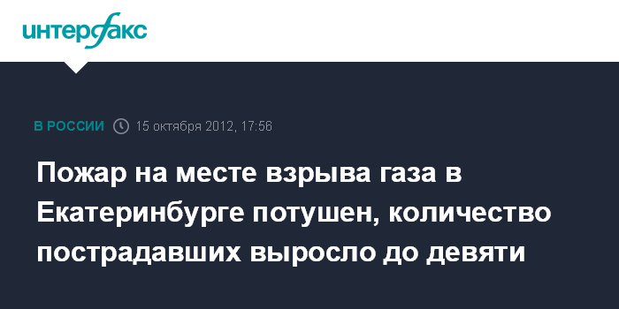 Москва.15 октября. INTERFAX.RU - Количество пострадавших при взрыве газа в Екатеринбурге возросло до девяти человек, сообщил "Интерфаксу" источник в силовых структурах города. "Там все потушено, пострадали девять человек, один из них скончался", - отметил источник.