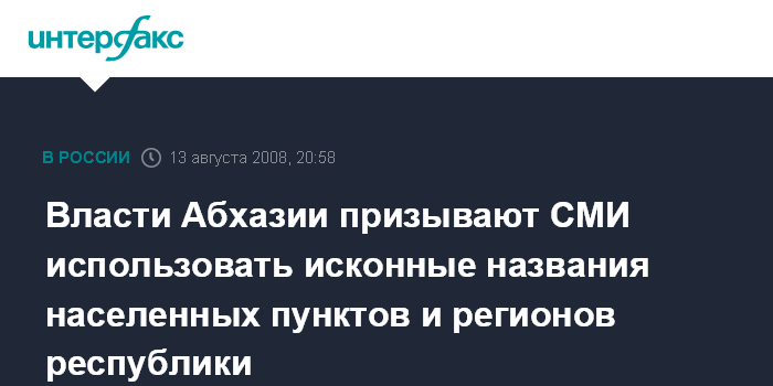 Сухум. 13 августа. INTERFAX.RU - Управление информации президента Абхазии обратилось к СМИ с просьбой об использовании действительных (утвержденных законом Абхазии) названий населенных пунктов и регионов республики.