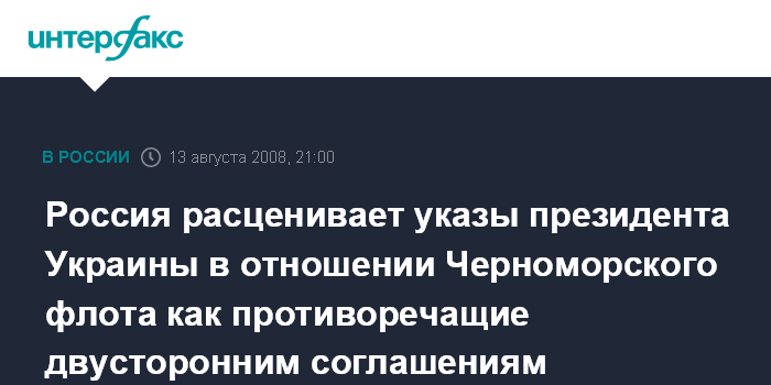 Москва. 13 августа. INTERFAX.RU - В Москве расценивают подписание президентом Украины Виктором Ющенко указов в отношении Черноморского флота РФ, как антироссийский шаг, который противоречит духу и букве соглашений между двумя странами по Черноморскому флоту и Договора о дружбе, сотрудничестве и партнерстве.