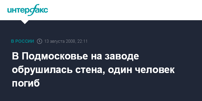 Москва. 13 августа. INTERFAX.RU - В результате обрушения стены на одном из подмосковных заводов один человек погиб и двое ранены, сообщает МЧС РФ. "Один человек погиб и два человека ранены в результате обрушения стены завода "Финанстраст", что в поселке Поварово в Солнечнегорском районе", - сообщили "Интерфаксу" в среду центральном региональном центре (ЦРЦ) МЧС.