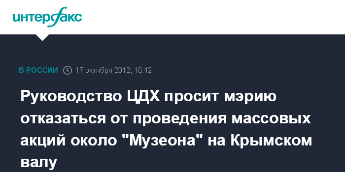 "Эти обстоятельства отрицательно влияют на имидж и, соответственно, финансовое положение ЦДХ. Обращаем Ваше внимание на тот факт, что никто из организаторов митингов не согласовывает этот вопрос с департаментом культуры г. Москвы, ГАУК г. Москвы МО "Музеон" и ЦДХ", - заявляет Д.Карлов.