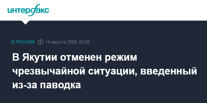 "В связи со стабилизацией паводковой обстановки решением комиссии по чрезвычайным ситуациям 13 августа режим ЧС на территории Верхоянского района отменен", - сообщили агентству "Интерфакс - Дальний Восток" в четверг в пресс-службе ГУ МЧС республики.