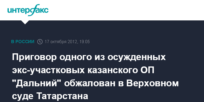 Казань. 17 октября. INTERFAX.RU - В Верховный суд Татарстана в среду поступила кассационная жалоба адвоката бывшего участкового ОП "Дальний" Рамиля Нигматзянова, осужденного Приволжским районным судом Казани на два года колонии-поселения.