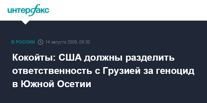 Москва. 14 августа. INTERFAX.RU - США в не меньшей степени, чем Грузия, несут ответственность за геноцид осетинского народа, заявил президен Южной Осетии Эдуард Кокойты.