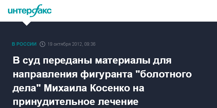 Москва. 19 октября. INTERFAX.RU - Генпрокуратура направила в суд очередное уголовное дело в отношении подозреваемого в участии в массовых беспорядках на Болотной площади Михаила Косенко, признанного невменяемым, сообщили в пресс-службе ведомства.