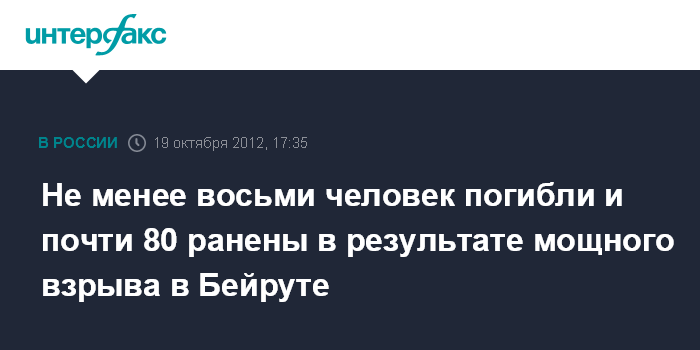 Бейрут. 19 октября. INTERFAX.RU - По меньшей мере, восемь человек погибли и еще 78 получили ранения в результате мощного взрыва бомбы в центре столицы Ливана Бейрута, сообщило в пятницу государственное информагентство Ливана.