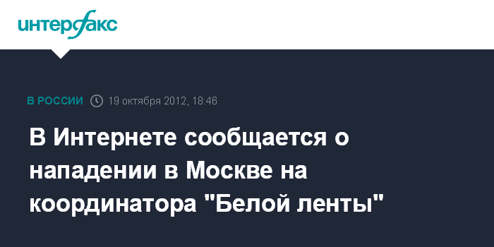 Москва. 19 октября. INTERFAX.RU - Гражданские активисты сообщают в Интернете, что на координатора движения "Белая лента" совершено нападение в центре Москвы.