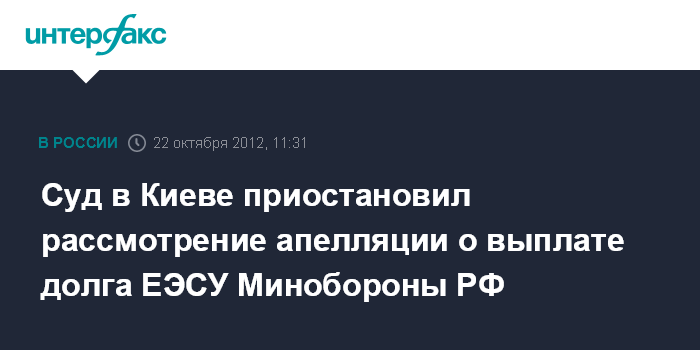 Киев. 22 октября. INTERFAX.RU - Апелляционный хозяйственный суд Киева приостановил производство по рассмотрению апелляции о выплате украинским правительством долга корпорации "Единые энергетические системы Украины" (ЕЭСУ) перед Министерством обороны Российской Федерации в связи с расследованием Службой безопасности Украины (СБУ) аналогичного уголовного дела.