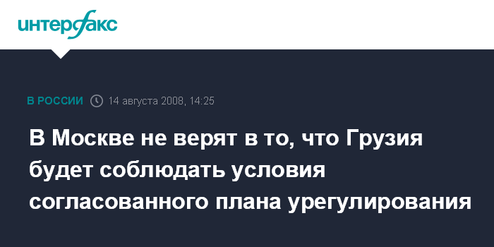 Москва. 14 августа. INTERFAX.RU - В Москве сомневаются, что Грузия будет придерживаться условий плана урегулирования, выработанного главами России и Франции.