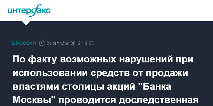 Москва. 24 октября. INTERFAX.RU - Правоохранительные органы проводят доследственную проверку по факту возможных нарушений при использовании средств, вырученных от продажи правительством столицы акций "Банка Москвы" и "Столичной страховой группы".