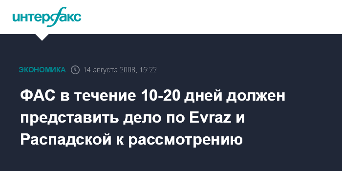Москва. 14 августа. INTERFAX.RU - Федеральная антимонопольная служба (ФАС) РФ в течение 10-20 дней должна представить дело по Evraz Group и ОАО "Распадская" к рассмотрению. "Мы планируем максимально ускорить процессы в интересах рынка", - сообщил журналистам глава ФАС Игорь Артемьев.