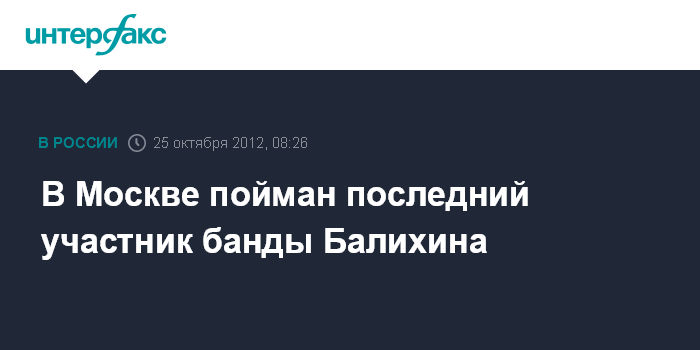 Москва. 25 октября. INTERFAX.RU - Последний участник банды Сергея Балихина, совершавшей убийства и ограбления, задержан в Москве, сообщил "Интерфаксу" в четверг источник в правоохранительных органах.