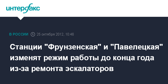 Москва. 25 октября. INTERFAX.RU - Работа по капитальному ремонту эскалатора повлечет за собой изменение режима работы станции "Фрунзенская" с 31 октября по 27 декабря 2012 года, сообщает пресс-служба Московского метрополитена в четверг.