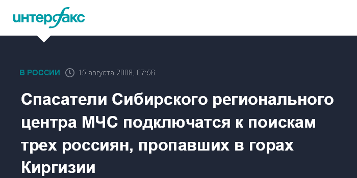 Красноярск. 15 августа. ИНТЕРФАКС-СИБИРЬ - Спасатели Сибирского регионального поисково-спасательного отряда примут участие в поисках трех российских альпинистов, пропавших в конце июля в горах Иссык- Кульской области на севере Киргизии.