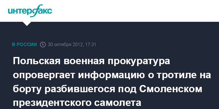 Варшава. 30 октября. INTERFAX.RU - Польские следователи, работающие в Смоленске, не подтверждают наличия тротила на обломках разбившегося президентского самолета, сообщил во вторник представитель военной прокуратуры Польши полковник Иренеуш Шелянг.