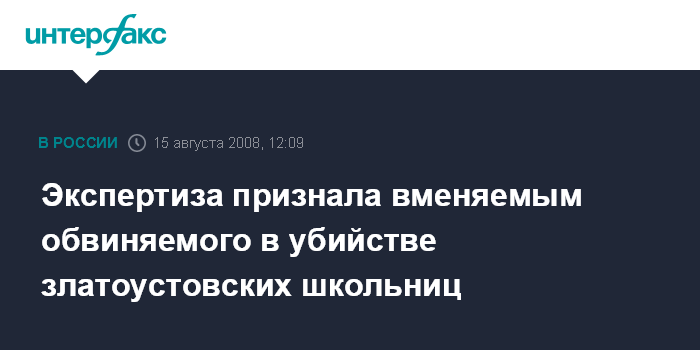 Москва. 15 августа. INTERFAX.RU - Судебно-психиатрическая экспертиза признала вменяемым жителя Челябинской области Николая Мозглякова, обвиняемого в убийстве и изнасиловании двух школьниц в Златоусте в апреле текущего года.