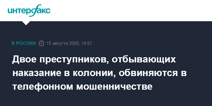 Москва. 15 августа. INTERFAX.RU - В Московский районный суд Чебоксар (Чувашия) поступило уголовное дело в отношении двух преступников, отбывающих наказание в мужской колонии общего режима №4, и их подруг, которые обманывали людей по телефону. Как сообщила пресс-служба суда, все четверо обвиняются в мошенничестве и покушении на мошенничество.