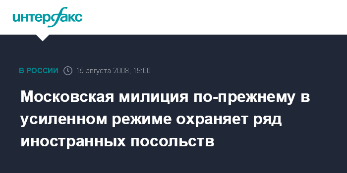 Москва. 15 августа. INTERFAX.RU - Столичная милиция продолжает охранять посольства стран, поддерживающих Грузию в грузино-осетинском конфликте, в усиленном режиме, сообщил источник в правоохранительных органах столицы. "Это усиление пока не снято. В общей сложности посольства в столице в настоящий момент охраняют 100 сотрудников милиции", - рассказал собеседник "Интерфаксу", отметив также, что "еще 180 человек занимаются отслеживанием акций и митингов, проходящих в Центральном округе столицы".