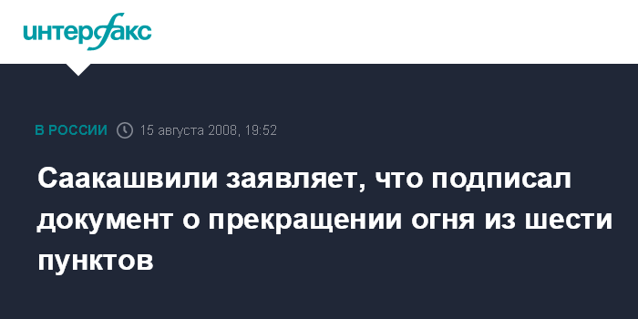 Тбилиси. 15 августа. ИНТЕРФАКС - Президент Грузии Михаил Саакашвили заявил, что им подписан документ о прекращении огня, состоящий из шести пунктов.