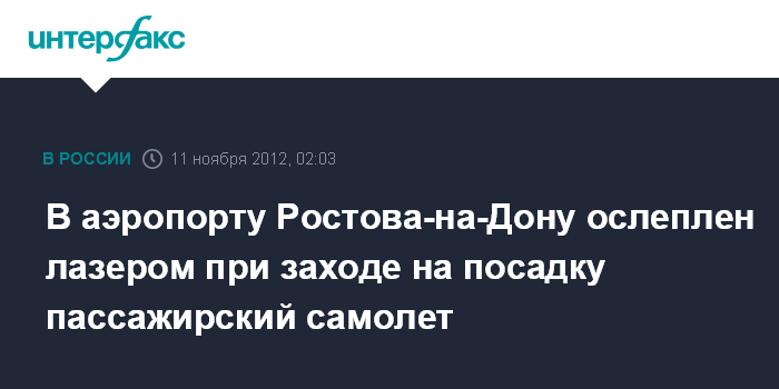 Ростов-на-Дону. 11 ноября. ИНТЕРФАКС-ЮГ - Экипаж пассажирского самолета, следовавшего из московского "Домодедово" в Ростов-на-Дону, был ослеплен лазером при заходе на посадку в ростовском аэропорту, сообщили агентству "Интерфакс - Юг" в правоохранительных органах Ростовской области.