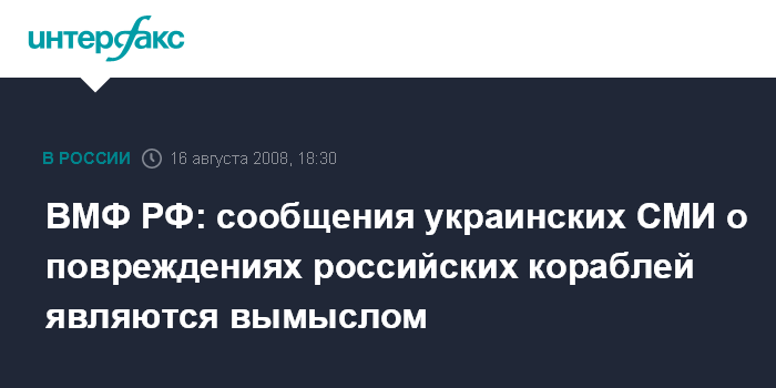Москва. 16 августа. INTERFAX.RU - Главкомат ВМФ России опроверг утверждения украинских СМИ о том, что в ходе операции по принуждению Грузии к миру российские военные корабли получили повреждения, а среди их экипажей были жертвы.