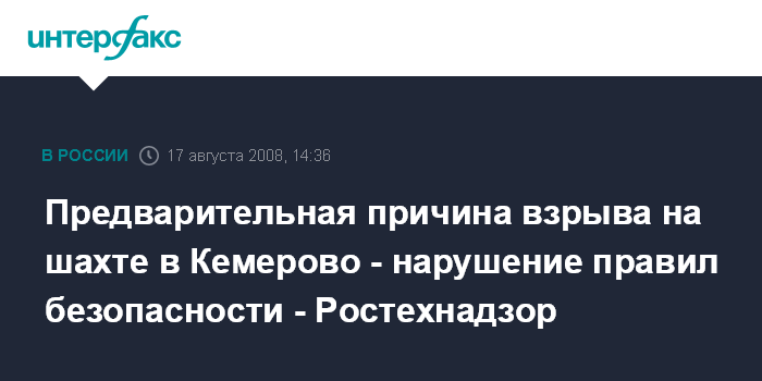 Москва. 17 августа. INTERFAX.RU - Причиной взрыва на шахте № 12 в Кемеровской области, в результате которого погибли три человека, по предварительным данным, стало грубейшее нарушение требований и правил промышленной безопасности, сообщил "Интерфаксу" пресс-секретарь Ростехнадзора Евгений Аношин.