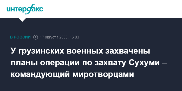 Сухуми. 17 августа. INTERFAX.RU - В ходе операции российских миротворческих сил по принуждению Грузии к миру в одной из боевых частей были обнаружены военная карта захвата Абхазии и другие боевые документы, сообщил журналистам в Сухуми командующий Коллективными силами СНГ по поддержанию мира в зоне грузино-абхазского конфликта генерал Сергей Чабан.