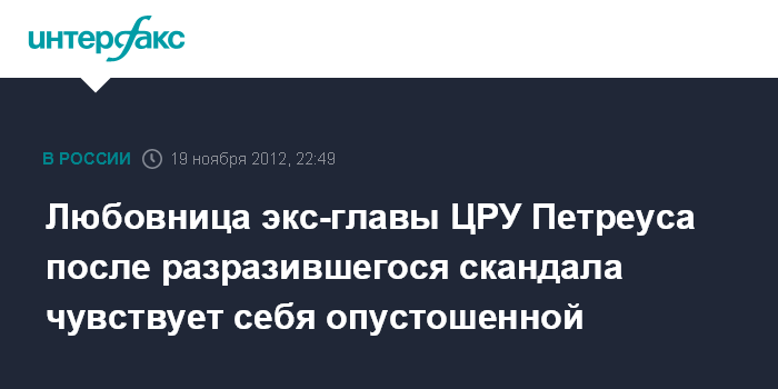 Вашингтон. 19 ноября. INTERFAX.RU - Экс-любовница бывшего главы ЦРУ Дэвида Петреуса чувствует себя опустошенной после разразившегося вокруг нее скандала, сообщил в понедельник американский телеканал ABC.