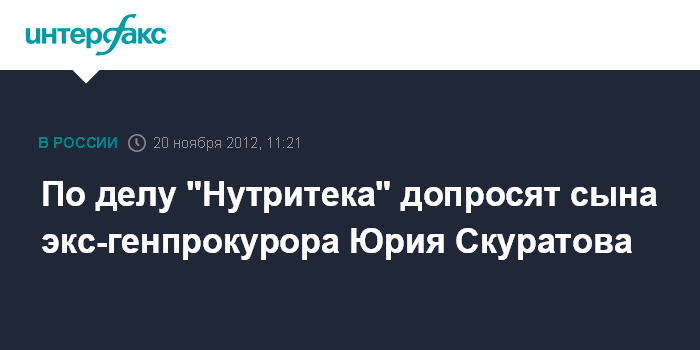 Москва. 20 ноября. INTERFAX.RU - В Следственный департамент МВД РФ для проведения следственных действий в рамках уголовного дела о мошенничестве с кредитом на покупку компании "Нутритэк" доставлен Дмитрий Скуратов - сын бывшего генпрокурора РФ Юрия Скуратова, сообщил "Интерфаксу" источник в правоохранительных органах.