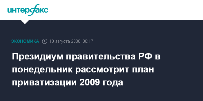 Москва. 18 августа. ИНТЕРФАКС - Президиум правительства РФ рассмотрит программу приватизации на 2009 год и основные направления приватизации на 2010-2011 годы на заседании в понедельник, сообщил журналистам источник в правительстве.