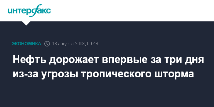 Москва. 18 августа. INTERFAX.RU - Нефть дорожает впервые за три дня на угрозе прохождения тропического шторма "Фэй" через районы нефтедобычи в Мексиканском заливе, сообщило агентство Bloomberg.