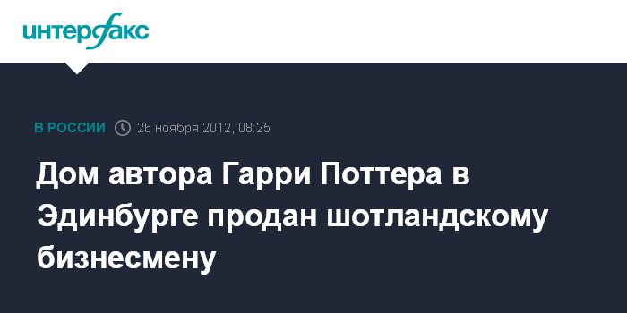 Эдинбург. 26 ноября. INTERFAX.RU - Дом в Эдинбурге, ранее принадлежавший Джоан Роулинг, автору серии романов о Гарри Потере, был продан шотландскому бизнесмену за неназванную сумму, сообщило агентство Bloomberg.