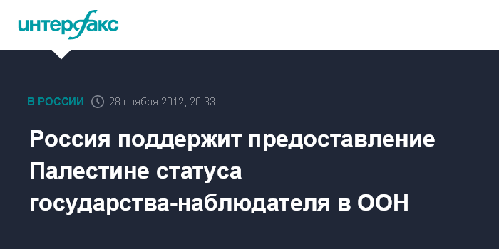"Как ожидается, 29 ноября в Генеральной Ассамблее ООН состоится голосование по внесенному палестинцами проекту резолюции о предоставлении Палестине статуса государства-наблюдателя, не являющегося членом ООН. Как неоднократно сообщалось, Российская Федерация будет голосовать за эту резолюцию с учетом нашей принципиальной позиции", - говорится в комментарии МИД РФ, размещенном в среду на сайте ведомства.