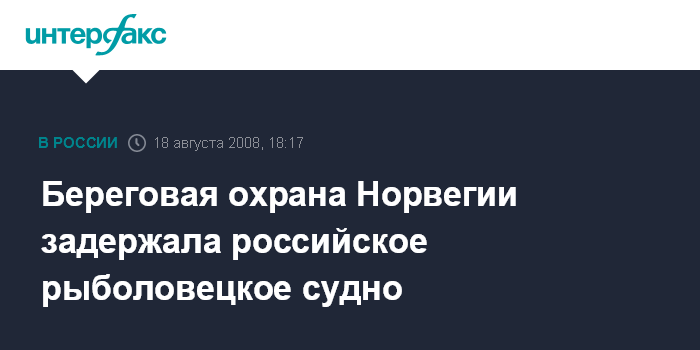 Москва. 18 августа. INTERFAX.RU - Береговая охрана Hорвегии 17 августа задержала российское рыболовное судно "Корунд" во время промысла в островной зоне Шпицбергена, говорится в сообщении Росрыболовства. Основанием для задержания российского корабля стало "незначительное превышение вылова маломерной рыбы, рассчитанное по норвежским правилам рыболовства". По российским нормативам, никакого нарушения не было, утверждает ведомство.