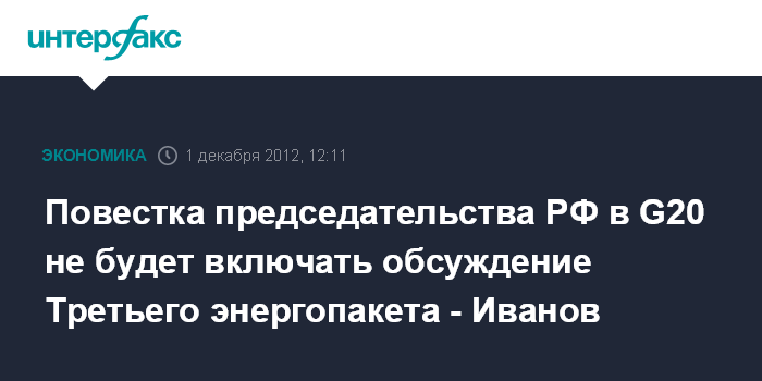 Повестка председательства РФ в G20 не будет включать обсуждение Третьего энергопакета - Иванов