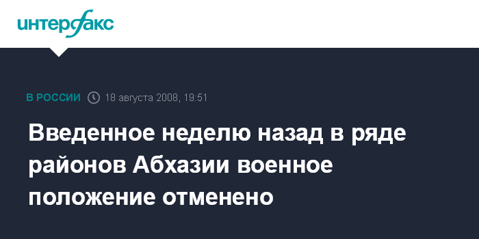 Сухуми. 18 августа. ИНТЕРФАКС - Президент Абхазии Сергей Багапш отменил военное положение в ряде районов республики, которое было введено 11 августа, сообщили журналистам в администрации главы республики.